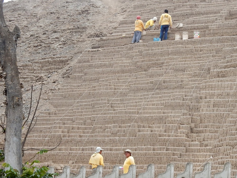 knapp 10 Mio. Einwohner hier. Unser Hotel liegt in Miraflores, einem der über 40 Stadtteile von Lima. Es gilt als eines der wohlhabenden und weitgehend sicheren Viertel der Landeshauptstadt. Natürlich sind unsere Zimmer noch nicht fertig und so genießen wir erst ein zweites Frühstück, was einem bei der voran gegangenen eher mageren Kost im Flugzeug nicht schwer fällt. Um 9.00 brechen wir auf zur Stadtbesichtigung. Es geht durch das vornehme Viertel San Isidro, in dem ein bemerkenswerter riesiger Olivenhain liegt, was für eine Großstadt wohl sehr ungewöhnlich ist. Erster Zwischenstopp ist an der Huaca Pucela, einer ehemaligen Tempelanlage aus der Inka-Zeit, wo sicher Milliarden von Ziegeln zu einer mehrere ha großen Anlage geformt wurden (Bild 2). Nächstes Ziel ist die Kirche San Francisco mit dem angeschlossenen Kloster. Hier beeindrucken in den Kellergewölben die abertausenden von Gebeinen, die in Mustern ausgelegt sind (Bilder 3 & 4). Zu Fuß geht es weiter über den Plaza de Armas zum Plaza Mayor, dem Zentrum von Lima, wo der gewaltige Regierungssitz und weitere prächtige Bauwerke den eindrucksvollen Platz bestimmen. Zufälligerweise erreichen wir ihn gerade zur Wachablösung, eine Kapelle spielt auf, doch wer eine strengmilitärische Zeremonie erwartet, hat ist angenehm überrascht und folgt dem Potpourri schmissiger Weisen (Bilder 5 - 8). Den Abschluss unsere kleinen Stadtbesichtigung bietet ein Besuch am „Liebespark“, wo ein überdimensioniertes sich küssendes Paar aus Beton zu besichtigen ist und man die Aussicht auf die Pazifikküste genießen kann, wo sich bei 14 ° Wassertemperatur die Surfer ein Stelldichein geben, wobei zu beachten ist, dass wegen der schlechten Wasserqualität vielfach ein Badeverbot herrscht (Bild 9). Den Abend eines langen, langen Tages beschließt man in einem der zahlreichen guten Restaurants im Viertel und kann vielleicht mit den kulinarischen einheimischen Köstlichkeiten erste Bekanntschaft machen (Bild 10).