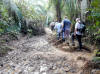 Eine anstrenge Vormittagstour erwartet uns. Dazu geht es bereits um 05.00 los, aber das ist wegen der zu erwartenden Mittagshitze notwendig. Nach einer kurzen Bootsfahrt flussabwärts erreichen wir die Zugangsstelle zum Nationalpark. Von hier führt ein etwa 3,5 km langer Trampelpfad durch den Regenwald zum Sandovalsee. Das hört sich machbar an, entwickelt sich aber dann zu einem 2-stündigen Kampf mit knöcheltiefen Schlamm, weil es vorher ausgiebig geregnet hat. Wir sind zwar alle mit wadenhohen Gummistiefeln ausgerüstet, was die Sache aber nicht weniger mühsam macht. Der Amazonasregenwald zählt zu den artenreichsten Gebieten der Erde, trotzdem müssen wir erfahren, wie schwierig es ist, diesen Reichtum an Fauna und Flora zu Gesicht zu bekommen. Nur die geschulten Augen unserer bewundernswert fachkundigen Führer ermöglichen es, verschiedene Vogel- und Affenarten in dem Baumdickicht ausfindig zu machen.