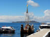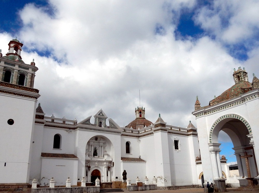 Inzwischen sind wir im Grenzort Kasani, also im östlichen Teil des Sees angekommen. Die Formalitäten der Aus- und Einreise sind schnell erledigt, während unsere Koffer per Lastenfahrräder die Grenze wechseln (Bilder 1 - 3). Natürlich haben wir nun nach nur zwei Stunden wieder eine neue Reiseführung und zwar in Form der sehr sympathischen Manuela, die in Deutschland aufgewachsen ist. Unsere erste Aktion im neuen Land ist, unsere Uhr eine Stunde vorzustellen. Erster Ort auf bolivianischer Seite ist Copacabana, natürlich nicht zu verwechseln mit dem brasilianischen Namensvetter. Das Städtchen liegt knapp 150 km nordwestlich von La Paz und ermöglicht den Zugang zum Titicaca-See von bolivianischer Seite. Die Bevölkerungszahl ist in den letzten Jahrzehnten deutlich angestiegen. Der Ort gilt als der bedeutendste Wallfahrtsort Boliviens. Sehenswert ist die Basilika mit der Figur „Dunkle Jungfrau“ (Bild 4). Anschließend dürfen wir eine Runde über den Markt drehen (Bild 5). Dann geht es zu einem wackeligen Steg, wo ein Katamaran auf uns wartet. Er bringt uns und eine weitere Reisegruppe nach kurzer Fahrt zur Isla del Sol (Bilder 6 & 7). Die ursprünglich Titicaca genannte Insel liegt etwa 1 km vom Festland entfernt. Hier leben in drei verschiedenen Communities etwa 2000 Menschen, die sich zurzeit aber gegenseitig das Leben schwer machen. Auf der Insel befinden sich einige sehenswerte Inka-Ruinen. Wir beschränken uns aber auf eine Schamanenzeremonie (Bild 8) und den Besuch der Quelle der ewigen Jugend, die wir nach 250 Stufen bergauf erreichen. Ob das trinkbare Wasser etwas hilft, werden wir vermutlich erst daheim überprüfen können. Zurück zum Schiff, dort wird während der Weiterfahrt ein köstliches Mittagsbuffet gereicht. Ein kurzer Stopp an der Mondinsel und nach knapp zwei Stunden erreichen wir den Hafen Cotoni. Da es eine Zeit lang dauert, bis unsere Koffer vom Schiff in den wartenden Bus verladen werden, dürfen wir derweil eine kleine Runde in einem der charakteristischen Binsenboote unternehmen, eine wirklich nette Geste des Reiseveranstalters. Natürlich ist es kein originales Boot mehr, denn die Binsen verfaulen alle zwei Jahre und deshalb verwendet man inzwischen zumindest für den Korpus andere Materialien.