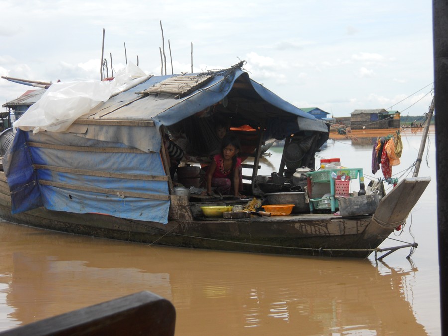 Wir erreichen den See. Um uns herum eine Vielzahl von Booten, ein paar große Hausboote und viele kleine Lastkähne, die Waren anbieten, und somit einen "floating Market" bilden, weiterhin ein paar im Flachwasser stehende Fischerhütten, die bei Hochwasser natürlich im See versinken. |