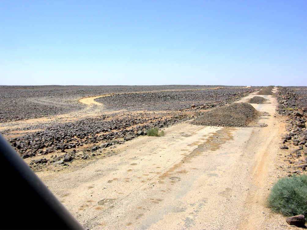 Der zweite Teil führt durch eine riesige, bis weit nach Jordanien reichende Steinwüste aus Basaltsteinen unterschiedlicher Größe. Hier quält man sich auf einer ausgesprochen schlechten Piste mühsam weiter. Aus diesem Grund ist die Gesamtstrecke wirklich nur etwas für hartnäckige Wüstenfans, die die absolute Einsamkeit lieben. Der Streckenverlauf ist in der Fliegerkarte 1 : 500000 recht genau wiedergegeben. Augenscheinlich wird die Strecke sehr selten benutzt.