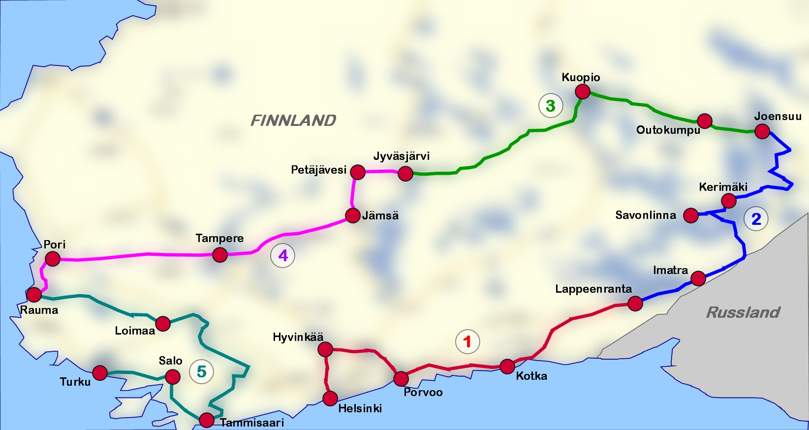 Helsinki - Hyvinkää - Porvoo - Kotka - Lappeenranta (301 km) |