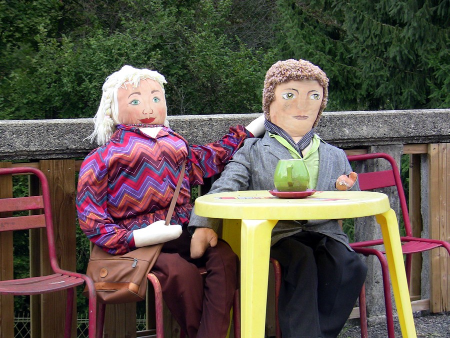 Ungezählte, mannshohe Puppen stehen am Balkon, hängen aus den Fenstern,